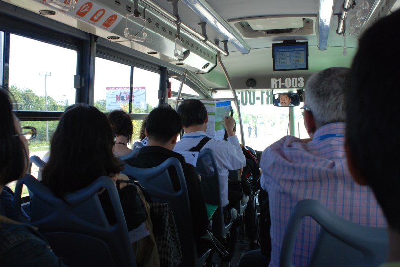 En høytstående embetsmann foran i bussen sender misbiliggende blikk bakover til NGO-representantene som synger. «Vi sitter alle i samme båt» er et kjent uttrykk. Men her sitter vi altså i samme buss – bokstavelig talt. Mens regjeringsrepresentantene har rosa delegasjonsbånd, har representantene for organisasjonene gule. Vi som representerer pressen har orange. Det er like mange av de gule og de rosa, men relativt få av de orange – så langt. Mange av møtene er lukket for dem med gule og orange bånd, men på bussen deler vi alt.