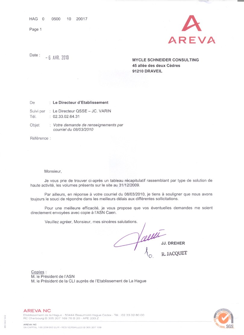 Dette brevet, fra operatøren av La Hague anlegget, viser at det er lagret store mengder flytende høyaktivt avfall ved La Hague.