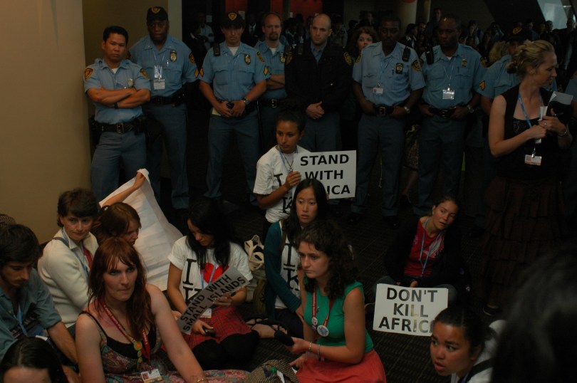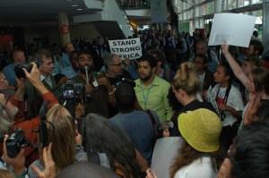 – Vi står sammen med Afrika, lød slagordene da et hundretalls observatører begynte å demonstrere og ville ta seg inn i den store salen der landene forhandler. En dør og et stort oppbud av sikkerhetsvakter var det eneste som skilte demonstrantene og ministrene som satt og snakket sammen.