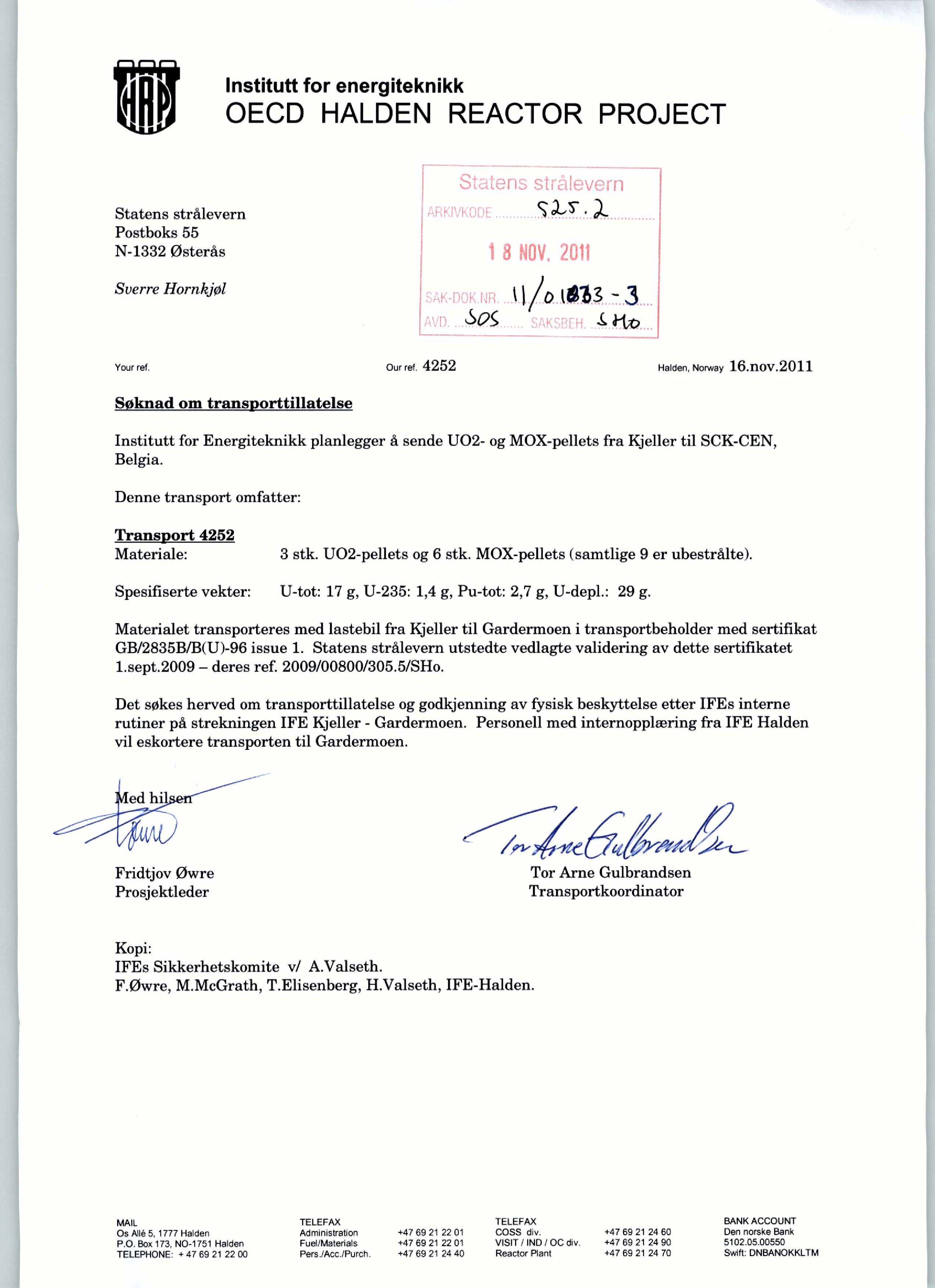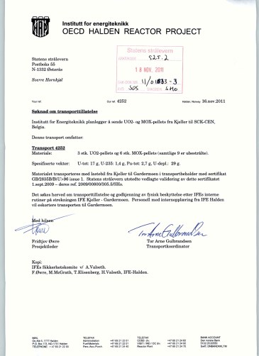 I april kontaktet jeg Statens Strålevern, for å få opplysninger om transport av radioaktivt materiale ut og inn av landet. Da jeg til slutt fikk innsyn i noen av dokumentene, viste ett av dem seg å være et brev fra IFE der de søkte om tillatelse til å føre MOX ut av landet med fly. Jeg kontaktet straks Strålevernet om saken for å få mer informasjon, men fikk i stedet tilbakemelding om at brevet var frigitt ved en feil. Det var unntatt offentlighet og jeg ble bedt om å makulere det.