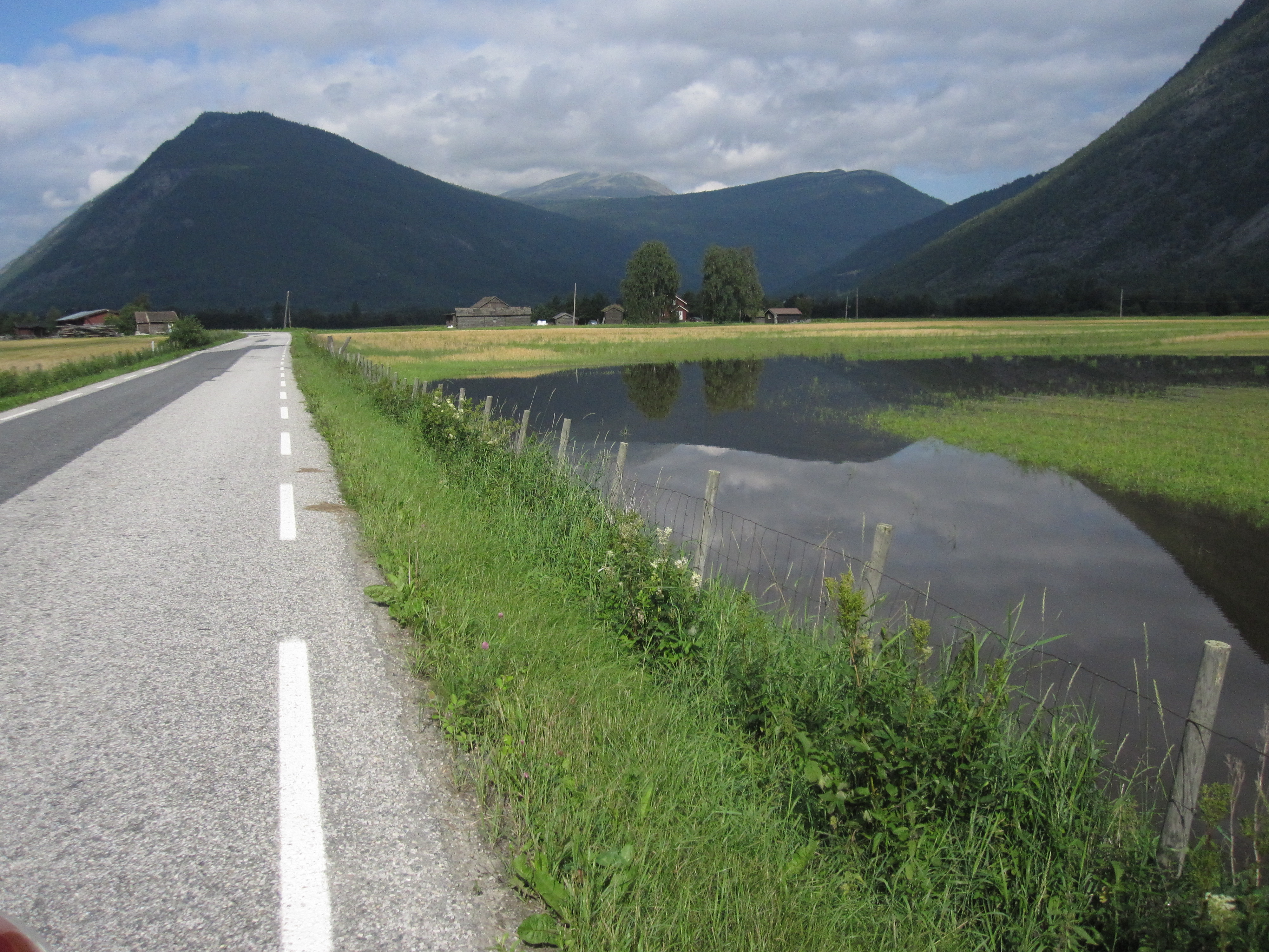 Inntens nedbør truer norsk matproduksjon. Her er vasstrukne jorder i Gudbrandsdalen etter flom i 2011. Foto Erik Martiniussen