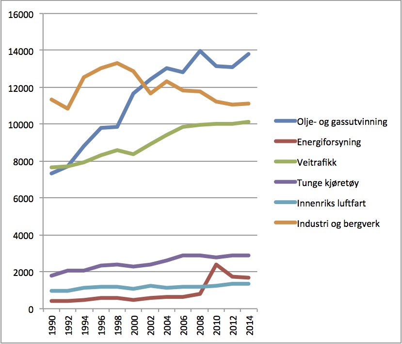 Det er en myte at norske klimagassutslipp går ned. Sannheten er at utslippene av norske klimagasser øker år for år i alle viktige sektorer. I olje- og gassektoren har utslippene gått opp med 89 prosent siden 1990, utslippene fra veitrafikken har økt med 32 prosent siden 1990, utslippene fra tungtransporten har økt med 60 prosent, og utslippene fra innenriks luftfart har økt med 40 prosent siden 1990. I tillegg har Norge bygd gasskraftverk som har tredoblet av utslippene fra energisektoren, viser tall fra Statistisk sentralbyrå.