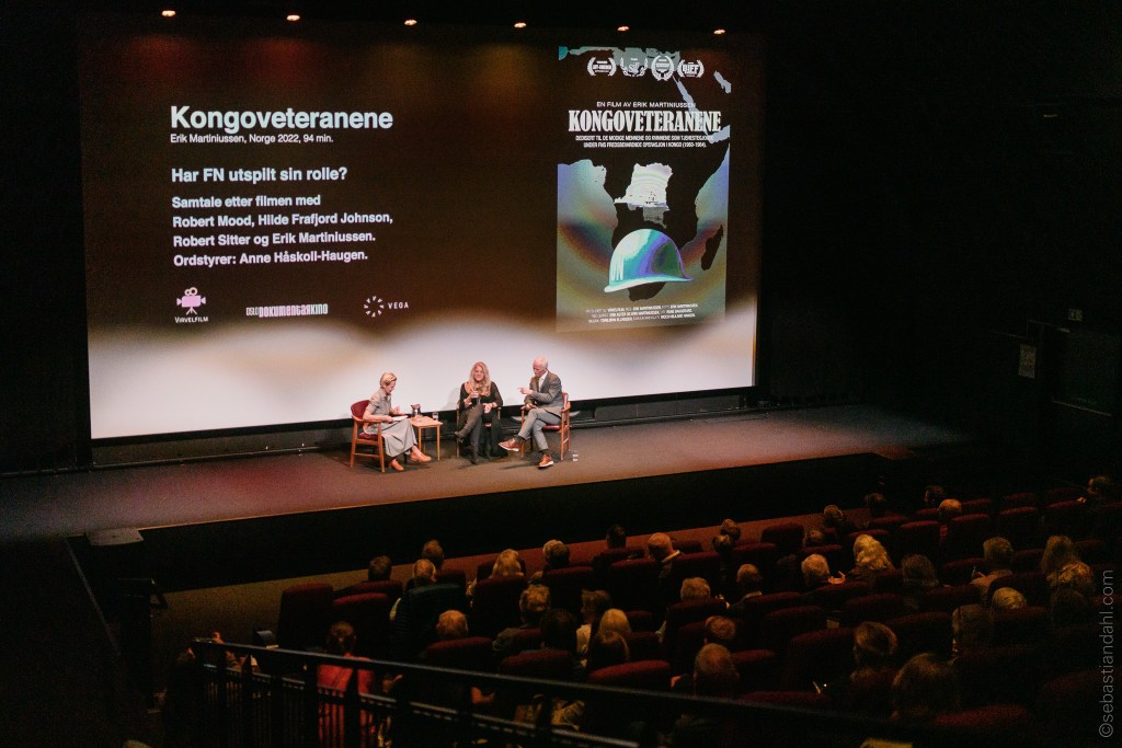Glad, lettet og litt stolt etter en fantastisk fin kveld på Vega Scene i går! Det har vært et langt løp, med mange hekker og utfordringer underveis. Finansieringen har jeg skrevet om før. Det har ikke vært lett. Så kommer alt arbeidet med å lete fram veteraner, deres familier og arbeidet med å bygge tillitt til dem som står fram med sine innerste og svært personlige fortellinger. Så kom korona. I går føltes det som om jeg nådde mållinjen: Robert Mood innledet kort før filmen og satte den på en fin måte inn i samtiden, med krig i Ukraina og et FN som virker å være spilt helt ut på sidelinjen. Etter visningen intervjuet jeg historier Robin Sitter, som tidvis har jobbet parallelt med meg med å hente fram historiene om Kongo-operasjonen, det ble et intervju med Linda Bertheussen, med fortid som bataljonssjef i Telemarksbataljonen. Hun fortalte om hvordan det er å være på utenlandsoppdrag for forvaret i dag, og til slutt fikk vi en spennende diskusjon mellom Robert Mood og Hilde Frafjor Johnson om hva som må til for å styrke FN som fredsoperatør i dag. Her var det flere referanser til filmen, og ikke minst det ekstreme pågangsmotet daværende generalsekretær i FN, Dag Hammarskjöld, utviste for å hindre at Kongo-krisen utviklet seg til en storkrig.